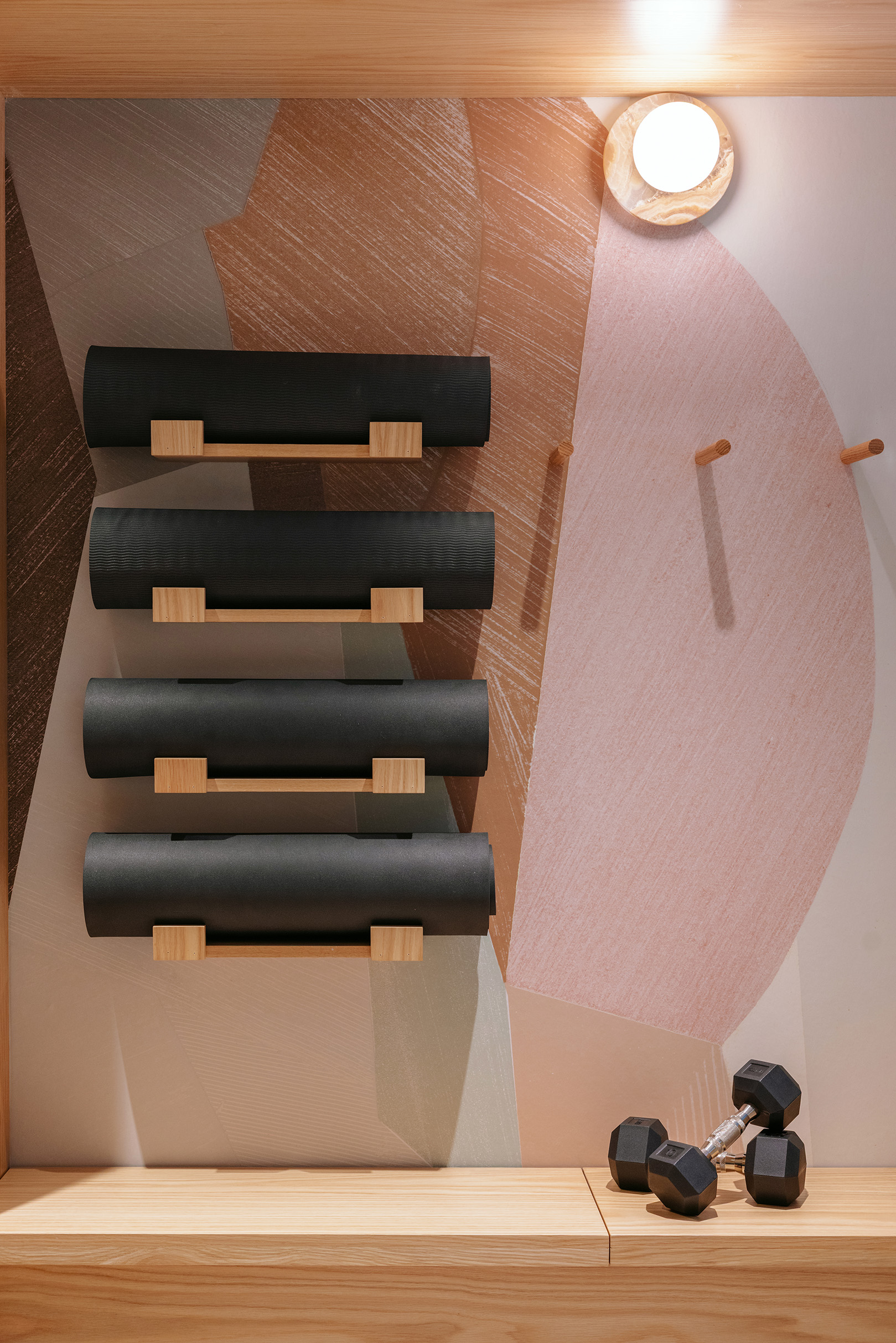 Design ingenuity turned constraints such as low ceilings and rigid concrete walls into opportunities. Strategic colour blocking, patterned wallcoverings, tinted mirrors and compact case goods enhance functionality and perceived volume without compromising integrity. The spatial experience unfolds through contrast: a dark exterior opens to a luminous interior; airy communal spaces transition to intimate, atmospheric washrooms, creating a layered sense of depth and character throughout.